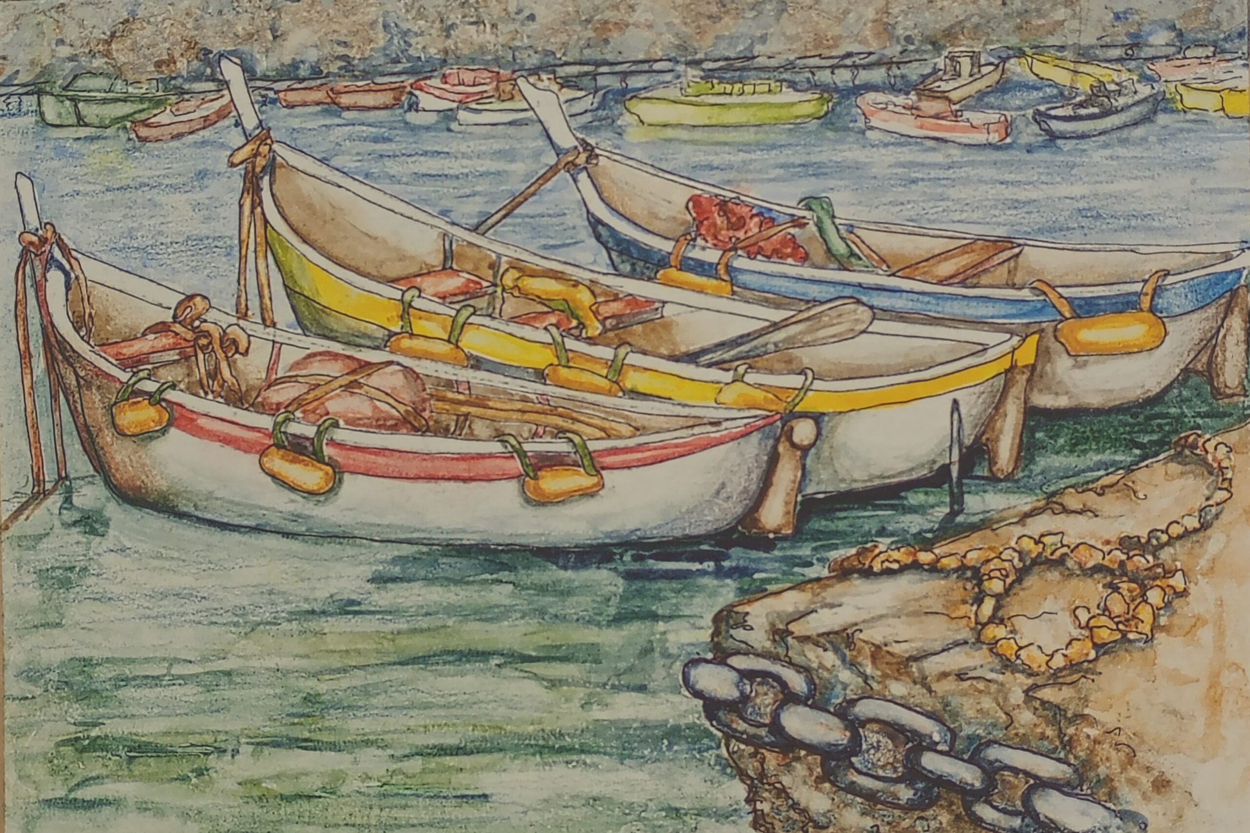 I’d made a rough sketch of these fishing boats while a friend and I waited for the ferry to take us to visit the Cinque Terre. I’ve always loved the 3 boats and their lovely flowing curves. I drew them up from my sketches and trip photos years ago, but not being confident with painting water I’d chickened out from going any further.
